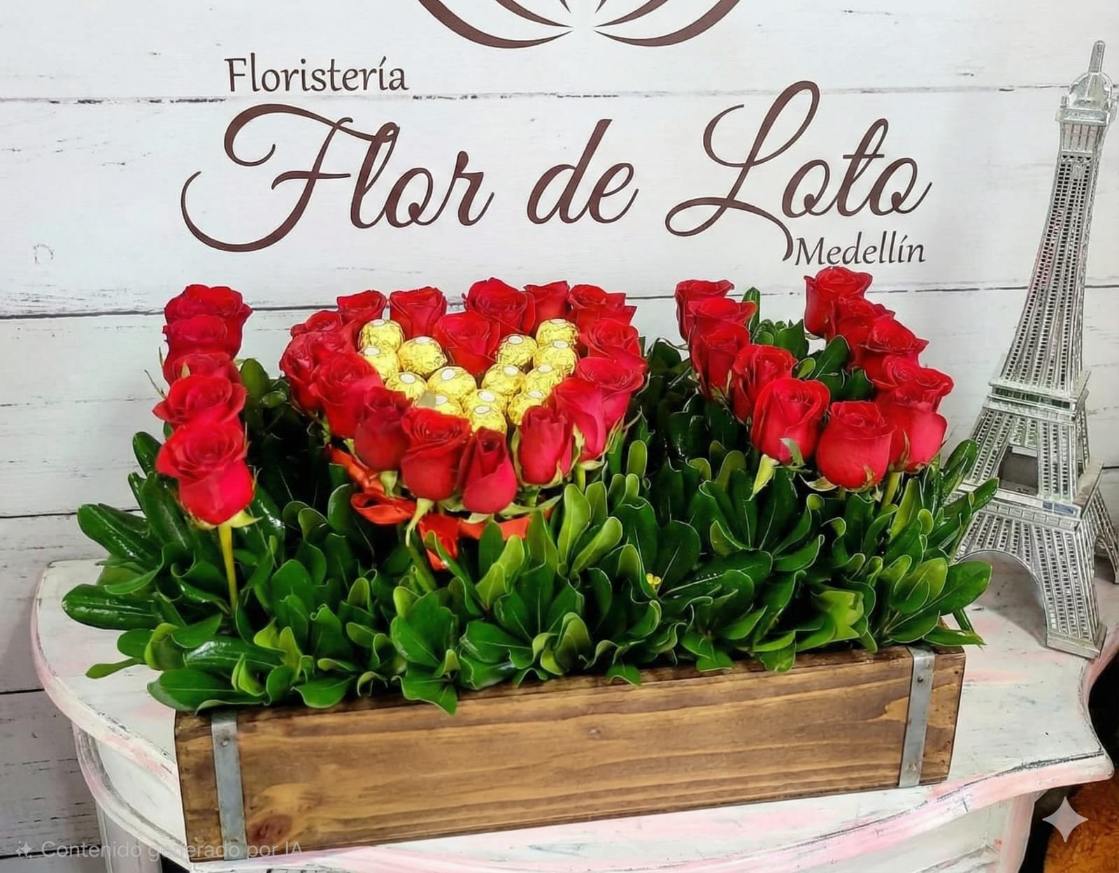 Expresa tus sentimientos con nuestro exclusivo diseño I Love You, una creación artesanal de Flor de Loto Medellín. Este elegante arreglo combina la pasión de las rosas rojas naturales con la dulzura de los bombones Ferrero Rocher, todo presentado en una sofisticada base de madera rústica. Es el detalle perfecto para aniversarios, meses o simplemente para decir ‘Te Amo’ con estilo y frescura.