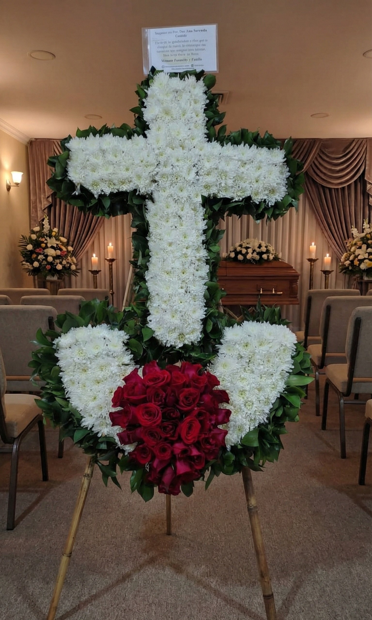 Este imponente arreglo fúnebre en Medellín combina la fe (cruz) y el amor eterno (corazón). Diseñado en gran formato sobre trípode, utilizando cientos de crisantemos blancos y un corazón central de rosas rojas tipo exportación. Ideal para rendir un homenaje solemne y destacado en la sala de velación. Incluye cinta impresa personalizada.